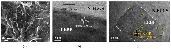 The surface morphology of the CoP/EEBP/N-FLGS nanocomposite was studied in detail using SEM and TEM techniques as well as related analysis methods. As can be seen from the SEM and TEM images, the sample is an aggregate of typical few-layer graphene and phosphorene structures with a lateral size of several microns (Figure 2a) and a thickness of about 2–5 nm (ca. 6–15 layers) in the case of graphene structures and 2–7 nm (ca. 6–20 layers) in the case of phosphorene structures (Figure 2b), the latter being uniformly covered with nanocrystalline spherical particles that are 2–5 nm in diameter (Figure 2c). The TEM images in Figure 2b,c clearly show crystal lattices with an interplanar spacing of 0.34 nm, 0.52 nm and 0.28 nm, which can be assigned to the (002) crystal plane of graphite, (002) crystal plane of BP and (011) crystal plane of CoP, respectively.