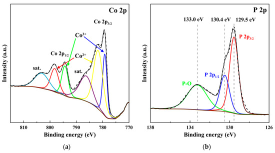 According to the survey XPS spectrum (Figure S3), CoP/EEBP/N-FLGS nanocomposite contains five elements, namely C, O, N, P and Co, whose surface concentration is given in Table S1. C 1s, Co 2p and P 2p high-resolution spectra are depicted in Figure S4 and Figure 3a,b, respectively. The deconvolution of the C 1s spectrum indicates the presence of various oxygen-containing functional groups on the surface of the graphene substrate, mainly, hydroxyl and epoxy (C–OH/C–O–C) groups [38]. Significant level of FLGS doping with nitrogen atoms during the plasma electrochemical synthesis was demonstrated earlier in [34]. The approximation of the Co 2p spectrum with mixed Gaussian/Lorentzian functions shows the presence of two doublets attributed to Co 2p3/2 and Co 2p1/2 as well as satellite peaks at 786.3 and 803.4 eV (Figure 3a). According to the literature data, the peaks at 780.4 eV and 795.7 eV are due to the main photoelectron responses of Co3+ ions, while the peaks at 781.8 eV and 797.6 eV are due to Co2+ ions [39,40]. Three peaks are observed in the P 2p spectrum at 129.5, 130.4 and 133.1 eV and can be attributed, respectively, to P 2p3/2, P 2p1/2 and oxidized phosphorus formed on the nanocomposite surface due to its contact with air [41]. It should be noted that N-FLGS was first to be used to improve the stability of the resulting catalyst. Moreover, according to [30], in graphene–phosphorene structures, EEBP acts as an electron acceptor, while N-FLGS act as an electron donor. In other words, EEBP attracts electrons from N-FLGS, creating a negative charge on the EEBP surface as well as a positive charge on the hole-rich surface of N-FLGS. This also agrees with the earlier conclusion about CoP formation during the interaction of Co2+ ions with negatively charged surface of EEBP. Moreover, based on the obtained binding energies of P 2p3/2 and Co 2p3/2 peaks, one can also conclude that P has a small negative charge δ–, while Co has a small positive charge δ+. This is explained by the fact that the peak in the P 2p3/2 spectrum at 129.5 eV can be assigned to the P in phosphide [42] since this peak is located at a lower binding energy than that in elemental phosphorus (130.2 eV) [43,44]. At the same time, the Co 2p3/2 peak at 780.4 eV can be attributed to the binding energy of the cobalt in phosphide since the peak has a positive shift compared to the peak typical of metallic cobalt (778.1 eV) [43,45]. All these facts prove the formation of cobalt phosphide nanoparticles on the surface of EEBP.