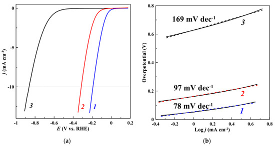 (a) LSV curves for CoP/EEBP/N-FLGS (1), CoP/EEBP (2) and EEBP (3) measured in a 0.1 M KOH solution (ν = 10 mV s−1, ω = 2000 rpm; the current density corresponds to the geometric area of the electrode); (b) corresponding Tafel plots for CoP/EEBP/N-FLGS (1), CoP/EEBP (2) and EEBP (3).