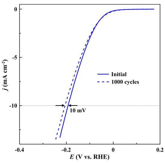 Based on the Tafel slope value, one can draw a definite conclusion about the rate-determining step of HER. However, this value for CoP/EEBP/N-FLGS (78 mV dec−1) is between the values typical of the Volmer (ca. 120 mV dec−1) and Heyrovsky (ca. 40 mV dec−1) steps [58,59]. For this reason, further studies are required to establish the most realistic HER mechanism for CoP/EEBP/N-FLGS.