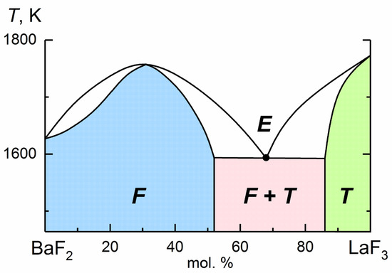 A schematic representation of the phase diagram of the BaF2–LaF3 system [44]. Letters F and T denote the regions of SSs with fluorite- and tysonite-type structures, respectively; E is an eutectic point.