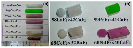 The composite synthesis was carried out by the technique of vertical directional crystallization with resistive heating in graphite multicell crucibles according to the method described in [47]. Rare-earth trifluorides and strontium difluoride powders (99.99%, LANHIT, Moscow, Russia), CaF2, and BaF2 (99.99%, Sigma-Aldrich, St. Louis, MI, USA) were used as initial components. The reagents were melted in a CF4 atmosphere to remove oxygen-containing impurities. The eutectic melts were kept at 1750 K for 3 h for homogenization. The crucible pulling rate was about 10 mm/h, and the cooling rate was 100 K/h. Composite boules with a diameter of 7 mm and a length of 30–40 mm were synthesized under the above-mentioned technological parameters (Figure 2a). The composite ingots had a large block structure and remained monolithic under mechanical impact without cracking (Figure 2b). The loss of crystallized material for evaporation did not exceed 0.75–1.00 wt.%.