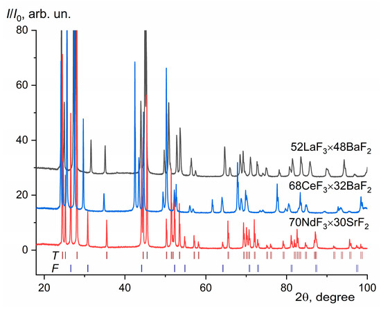 The XRD patterns of eutectic composites. The positions of the Bragg peaks of the tysonite-type (T) and fluorite-type (F) phases for composite 70NdF3 × 30SrF2 are shown.