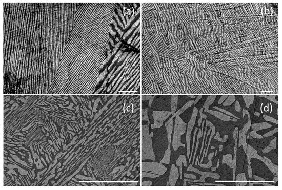 Optical micrographs of longitudinal (a) and transverse (b–d) sections of the selected composite ingots. The length of the scale bar is 200 μm.