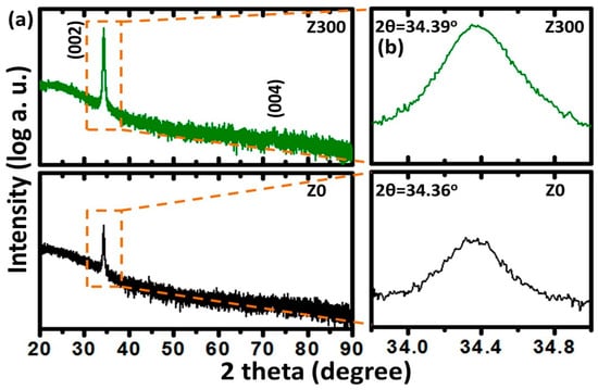 The X-ray diffraction patterns for the Z0 and Z300 samples are shown in Figure 1a. The XRD spectra confirm that both samples demonstrated a tough peak positioned at approximately 2θ = 34°, which was related to the high grade of the c-axis orientation with a wurtzite crystal structure along the ZnO (002) plane (JCPDS Card: 36-1451). The great intensity of the diffraction spectra generated from the ZnO (002) plane was owed to the puniest surface energy in the ZnO (002) basal plane in the wurtzite crystal structure, promoting a crystallographic orientation together with the [001] preferred crystalline direction. The peak intensity of the ZnO (002) diffraction angle was enhanced considerably by increasing the temperature and time of the postannealing modification, which was due to much more energy improving the crystallinity via the postannealing process. In addition, in the XRD spectrum of sample Z300, there is still one slight peak located at around 76.6°, indexing as ZnO (004). It can be known that, without any peaks except that at (00n), diffraction angles were obtained over a large angular range (θ–2θ scan), indicating the ZnO film did form onto the glass substrates epitaxially. On the other hand, it was demonstrated that the ZnO (002) diffraction peak slightly changed from a low-angle region (2θ = 34.36°) toward a high-angle region (2θ = 34.39°), as shown in Figure 1b, indicating that the internal stress of the ZnO films was modulated via a direct postannealing modification.