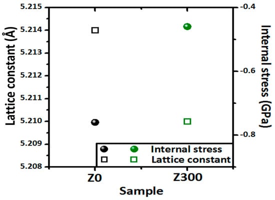 The relationship between lattice parameter/constant and internal stress of samples Z0 and Z300, respectively.