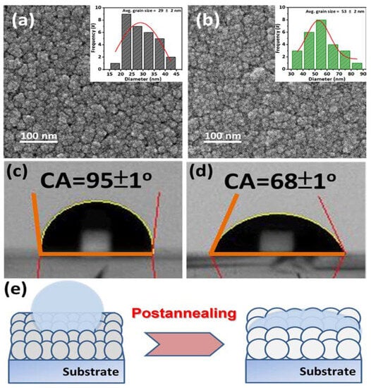 Meanwhile, the different internal stresses would result in different microstructures, and the plan-view SEM images for the as-prepared ZnO films and those with a postannealing modification at 300 °C are shown in Figure 3a,b. Figure 3a,b display the modulational grain microstructures accompanied by a change in the grain size corresponding to samples Z0 and Z300, respectively. This kind of grain size transition was induced by a postannealing modification that could be easily manipulated. The as-prepared ZnO film’s (Z0) average grain size was 29 ± 2 nm, as displayed in the inset of Figure 3a. In addition, the average grain size of the ZnO film with a postannealing modification at 300 °C (Z300) was 53 ± 2 nm, as shown in the inset of Figure 3b. The grain size histograms for the fractions and distribution analysis using a Gaussian mode fitting curve (red line) are shown in the inset of Figure 3a,b. Such a kind of improvement could be attributed to obtaining a much higher heat energy during the postannealing modification that directly led to an enhancement in the grain growth kinetics, and the microstructure of the ZnO films could be modulated via the varied temperature and time of the postannealing modification—this could be known via the postannealing modification. The nanograins with complex domains amalgamated and combined with each other to develop grain coalescence, as displayed in Figure 3b. This could also have been due to the presence of apertures or pores located between the grains that could absorb oxygen inside and exist on the surface of film. The corresponding images of the water droplets on the ZnO surfaces are displayed in Figure 3c,d. The surface water contact angles (CAs) were 95° and 68° for the Z0 and Z300 samples, respectively. The as-prepared ZnO film showed a hydrophobic wetting status, owing to the smaller nanograin size, and much more apertures supplied the trapping of oxygen that decreased the contact area between the surface area of the ZnO and water droplets, as displayed in Figure 3c. With a postannealing modification at 300 °C, the microstructure surface showed a hydrophilic status, owing to the giant grain size and smooth surface, so it would obtain smaller apertures that could not supply the trapping of oxygen between the interface of the ZnO compound and the water droplet, as shown in Figure 3d. This transformation caused the CA to decrease from a hydrophobic (CA = 95°) to hydrophilic (CA = 68°) status, and it was induced by the fewer apertures formed with a postannealing modification at 300 °C. The schematic diagram illustrates the different modes, displaying the status of the water droplets on the different surface structures of the ZnO compounds, as shown in Figure 3e. The microstructure containing smaller grains had much more apertures and exhibited a hydrophobic wetting status without any modification. In addition, the smooth surface with a grain growth phenomenon led to far less oxygen trapping between the interface of the ZnO compound and the water droplet, and then induced the wetting behavior to change from a hydrophobic to hydrophilic status, which served as a surface indication of the grain coalescence to form a giant grain size. In short, the surface hydrophilicity was promoted when there was less oxygen absorbed between the solid and liquid surface, demonstrating a decrease in CA via a simple postannealing modification, as schematically displayed in Figure 3e.
