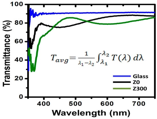 Transmittance spectra of the prepared samples Z0 and Z300 compared with pure glass substrate, respectively.