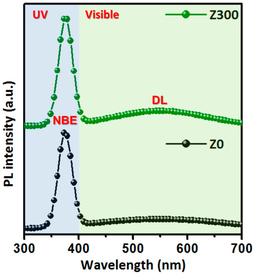 As a photonic material, it is important to verify the optical performance of ZnO compounds, and photoluminescence (PL) spectra are considered as a regular method. Generally, it is known that the PL emission spectrum of ZnO compounds can be separated with two main sections. The first section belongs to the near-band-edge (NBE) emission spectrum, which is originated from the free-exciton recombination generation in the UV zone. Another one is the deep-level (DL) emission spectrum, which is originated from the possible defects and related impurities, mainly including oxygen vacancies and zinc interstitials that are caused by the suppression of the DL emission spectrum in the visible zone. Figure 5 displays the PL spectra for both samples Z0 and Z300, respectively. Both samples demonstrate a tough NBE emission spectrum, which is positioned at approximately 374 nm and acts as the dominant recombination mechanism of photogenerated charge carriers (excitonic photoemission). In contrast, another negligible defect band, which is positioned at approximately 546 nm (DL emission), induced by the intrinsic defects, mainly including oxygen vacancies and zinc interstitials, possibly existed in the ZnO compound, demonstrating that the ZnO compounds were nearly defect-free. It is noteworthy that the tough peak of the NBE emission spectrum for sample Z300 was slightly changed toward a high-wavelength band compared to the sample Z0. Based on previous published works, the peak shifting of the NBE emission for the PL spectrum of the ZnO in our present work can be induced by the quantum-size confinement effect [53,54,55]. On the other hand, the PL peak intensity in the UV band of sample Z300 was slightly larger and narrower than the as-prepared sample Z0, which was related to the degree of crystallinity in the ZnO compound. In other words, it indicates that the PL spectra display an identical trend compared to the analysis results of the XRD, as both the crystallinity and optical characteristics were simultaneously enhanced. Furthermore, the PL intensity of the peak in the DL band with sample Z300 was slightly greater than that of sample Z0, owing to the increasing oxygen vacancy while losing the oxygen atoms from the ZnO compound during the postannealing modification under a vacuum atmosphere.