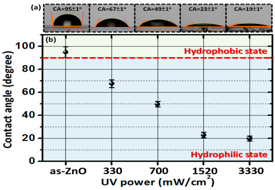 From the above-mentioned results, the highly textured ZnO prepared at an RF power of 75 W without any postannealing modification showed hydrophobic wetting behavior and its corresponding CA value was 95 ± 1°. However, photocatalytic behavior has been widely reported and demonstrated by many works [56,57]. With the purpose of modulating the wetting behavior of the ZnO, the sample Z0 was illuminated by ultraviolet (UV) light with a wavelength of 365 nm. This wavelength and strength of the UV light had a photon energy larger than the intrinsic band gap (3.37 eV) of the pristine ZnO. The relationship between the different strengths of the UV illumination ranged from 330 to 3330 mW/cm2 and the water contact angles (CAs) are displayed in Figure 6. Figure 6 displays the related water CA images accompanied by the as-prepared ZnO compound (sample Z0). The drop of liquid water spread on the surface of sample Z0 with a nanograin structure after UV illumination for 10 min with different strengths ranged from 330 to 3330 mW/cm2. It can be clearly observed that the CA value of sample Z0 was reduced from 95 ± 1° to 67 ± 1° under the ultraviolet illumination with 330 mW/cm2 UV power. Moreover, the water CA value was highly reduced from 95 ± 1° to 49 ± 1° under the ultraviolet illumination with 700 mW/cm2 UV strength. Then, the water CA angles were dramatically dropped from 95 ± 1° to 23 ± 1° and 19 ± 1° under the ultraviolet illumination with 1520 and 3330 mW/cm2 UV strength, respectively. This demonstrates that the surface free energy of the ZnO compound was significantly modulated by the different strengths of ultraviolet illumination and demonstrated the typical photocatalytic characteristics. In addition, the rapid reduction in the CA values of the as-prepared ZnO compound was contributed from the photocatalytic action in the ZnO, owing to the generated electron-hole pairs upon photoillumination induced by photoelectron emission. These holes and electrons can either recombine or move to the surface of semiconducting oxides to react with groups adsorbed on the surfaces of the semiconducting oxides. Furthermore, when the UV light was illuminated on the ZnO compound and the generated photon energy was equal to or greater than the band gap of the ZnO compound, the electrons (e−) were excited into the conduction band from the valence band. Simultaneously, the same number of holes (h+) were produced in the valence band and some of the holes reacted with surface oxygen atoms or lattice oxygen (O2−) to develop surface oxygen vacancies O1−, while the electrons combined with lattice metal ions (Zn2+) to develop Zn2+ defective sites. With the purpose of absorbing dissociatively on the imperfect sites, the oxygen and water molecules would contest with each other. The surface status of the semiconducting oxides caught electrons (Zn+) toward reacting with oxygen molecules adsorbed on the surface status of the semiconducting oxides. At the same time, the water molecules could coordinate with oxygen vacancy sits (VO), which led to the dissociative adsorption of the water molecules onto the surface status of the ZnO semiconducting oxide. The imperfect sites were kinetically more desirable for the hydrophilic adsorption of hydroxyl groups (OH−) than the adsorption of oxygen molecules.