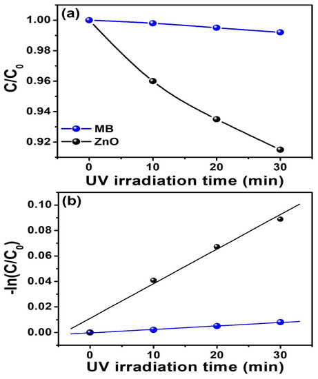 (a) (C/C0) and (b) −ln(C/C0) ratios as a function of reaction time for photocatalytic degradation of MB solution in the presence of the ZnO film under UV illumination.