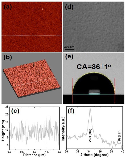 AFM topographical morphology for the Pt/ZnO bilayer films (a) 2D feature; (b) 3D feature for (a), and (c) a line scan profile of Pt/ZnO bilayer films related to (a,b), with a scanning area of 2 × 2 μm2. (d) A topical SEM micrograph. (e) Related CA image. (f) Related X-ray diffraction pattern.