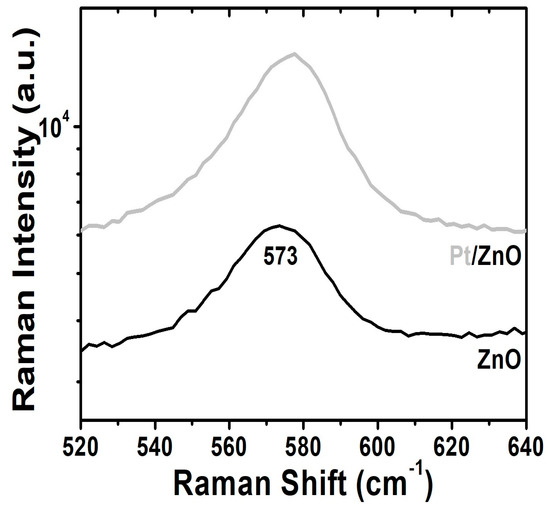 In addition, the surface plasmonic resonance (SPR) was induced by coupling oscillations between the electrons and photons that could be obtained and generated from the interface between the Pt metal and ZnO semiconductor, with the purpose of designing SPR heterostructures. Usually, the pure metals could offer surface plasmonic collective oscillations of free electrons, which could collect the electromagnetic (EM) waves to a little fraction of wavelength while enhancing the local field energy by several orders of magnitude [69]. It was reported that the local EM field known by some molecules on the metal surface at the nanoscale was dramatically enhanced, producing a considerably enhanced Raman intensity [70]. We concluded that such a kind of ZnO semiconductor capped with a continuous Pt nanolayer with a suitable thickness could induce a localized field onto its surface, producing a coupling effect and displaying the SPR. With the purpose of confirming this idea, the Raman spectra of the pristine ZnO and Pt/ZnO bilayer heterostructures at room temperature were measured, as shown in Figure 9. The Pt/ZnO heterostructured films showed an outstanding signal enhancement, and the frequency of the 1LO phonon peak was positioned at about 573 cm−1 corresponding to the A1 (LO) phonon, while the E1 (TO) mode was forbidden owing to the Raman selected rule [71,72]. Thus, the absence in the measurements with the TO mode further confirmed that the ZnO film had a high c-axis orientation. Hence, all the measured results inferred from the X-ray diffraction patterns and Raman analysis showed the same tendency.