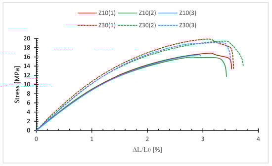 At 30% (Z30), the average Rm is 19.42 MPa with a standard deviation of 0.32 MPa and a Young’s modulus of 1.15 GPa.