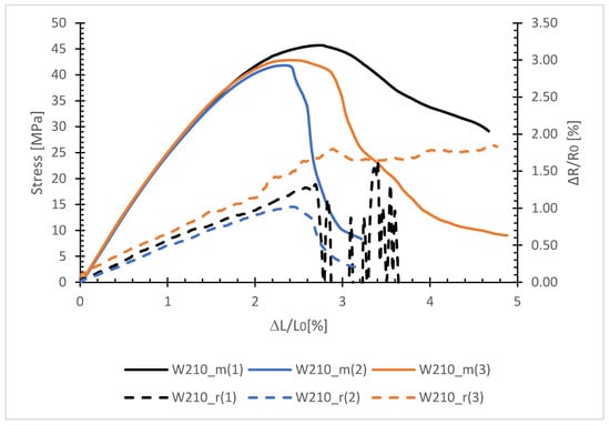 Perfect adhesion between fiber and matrix (W210_r(2) curve) with sharp breakage: the resistive signal is the image of mechanical behavior, with a maximum detected in the same zone as for stress. Sample rupture is marked, with perfect breakage of the carbon fiber leading to loss of signal.