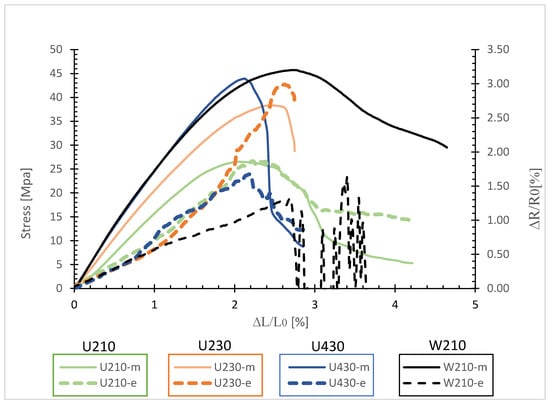 Figure 6 shows the evolution of stress (curve with the annotation “m” for mechanical) and relative resistivity (curve with the annotation “r” for resistivity) as a function of relative elongation for the W-shape sample with 10% internal density and 2 layers of resistive elements. There are three distinct cases of evolution in resistivity.