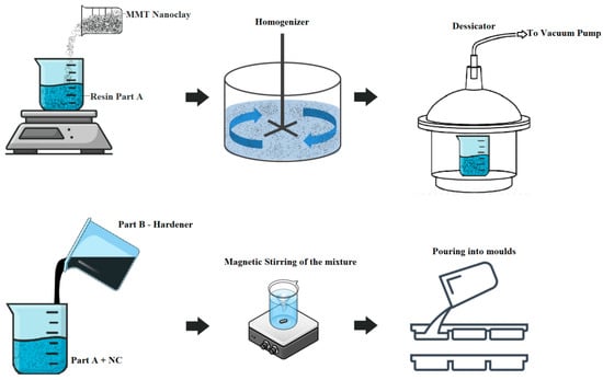 The FormuliteTM 2501A and FormuliteTM 2401B amine-cured epoxy systems were procured from Cardolite Specialty Chemicals India LLP, Mangalore, Karnataka, India. Part A of the epoxy system was mixed with montmorillonite nanoclay (NC) in specific weight percentages (wt.%) of 1, 2, and 3%. The mixture was placed in a homogenizer and agitated at a speed ranging between 1000 and 5000 rpm at room temperature for 10 min. Subsequently, the mixture was transferred to a desiccator with a hot bath maintained at the temperature of 80 °C for 30 min to remove the air bubbles. The hardener, designated as Part B, was then added to the mixture in a ratio specified by the company. This mixture was magnetically stirred for 10 min to ensure homogeneous NC distribution within the epoxy. The resulting mixtures were poured into molds to create rectangular sheets of nanoclay-filled FormuLITETM amine-cured bio-based epoxy composites. Figure 1 illustrates the stages involved in the processing of nanoclay-filled FormuLITETM.