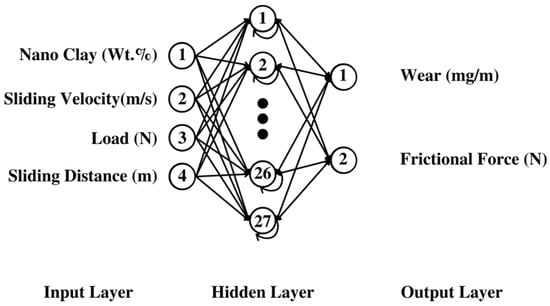 The BPANN aimed to predict two output parameters: Wear Rate (mg/min) and Frictional Force (N). The training involved a single hidden layer of 27 neurons using normalized input values. The network configuration was structured as 4-27-2, encompassing 4 input neurons, 27 hidden neurons, and 2 output neurons. Nine patterns were utilized for both training and testing. The logarithmic sigmoid (logsig) function served as the transfer function. The training concluded after 8000 epochs, reaching a sum of squared error (SSE) of 0.0008. The learning factor (η) and momentum factor (α) were set at 0.6 and 1, respectively. The configuration of our neural network is depicted in Figure 2.