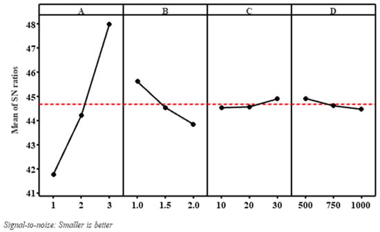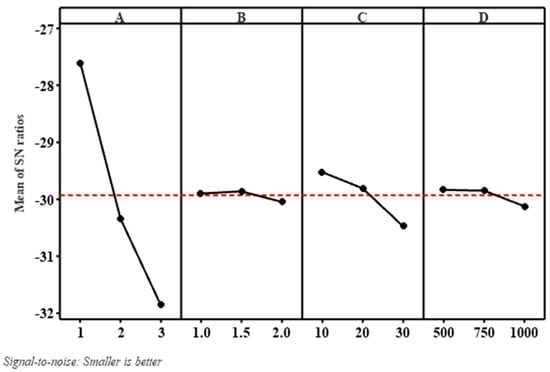 In the conducted experiment, the wear of the material was measured under varying conditions of nanoclay weight percentage (A), sliding velocity (B), load (C), and sliding distance (D). The main effect plots, depicted in Figure 3, for the signal-to-noise ratios (S/N ratios) indicate that the highest S/N ratios were observed at the third level of nanoclay (A3), the first level of sliding velocity (B1), the third level of load (C3), and the first level of sliding distance (D1) when following the “smaller is better” criterion.