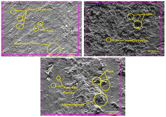 Scanning Electron Microscopy (SEM) and Energy-Dispersive X-ray Spectroscopy (EDS) analyses were performed on the nanoclay-filled FormuLITETM amine-cured bio-based epoxy composite samples to study the dispersion and integration of nanoclay within the matrix and its implications on the overall properties of the composite material. The SEM analysis provided high-resolution images of the samples, revealing a uniform dispersion of the nanoclay within the FormuliteTM matrix (Figure 5). The even distribution indicates successful mixing during fabrication, which is crucial for the mechanical and physical properties of the composites. This uniform dispersion is advantageous as it promotes optimal load transfer and stress distribution within the composite, enhancing the mechanical properties.