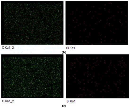 Figure 6. EDS analysis {Carbon and Silicon dispersion} (a) 1 wt.% Nanoclay (b) 2 wt.% Nanoclay (c) 3 wt.% Nanoclay.
