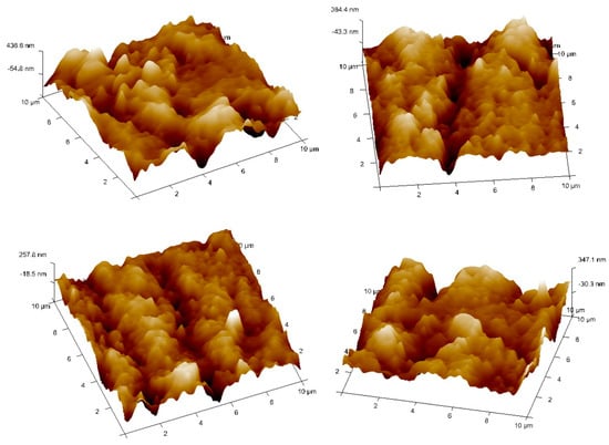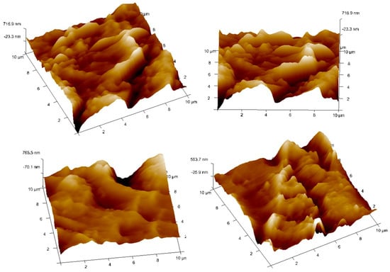 Subsequently, Atomic Force Microscopy (AFM) was used to examine the surface morphology and topography of the composite material at the nanoscale level. The AFM results (Figure 7, Figure 8 and Figure 9) revealed that including nanoclay in the FormuliteTM resins increased the surface roughness and peak height. Interestingly, the highest peak height for the composite with 1% nanoclay was 842.5 nm. The average peak heights for the composites with 1%, 2%, and 3% nanoclay ranged between 647 nm and 1 µm, 257.8 and 436.6 nm, and 553.7 and 765.5 nm, respectively.