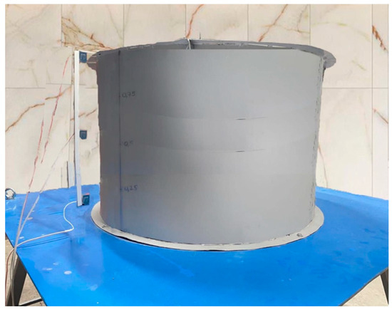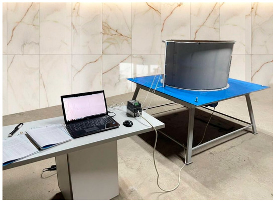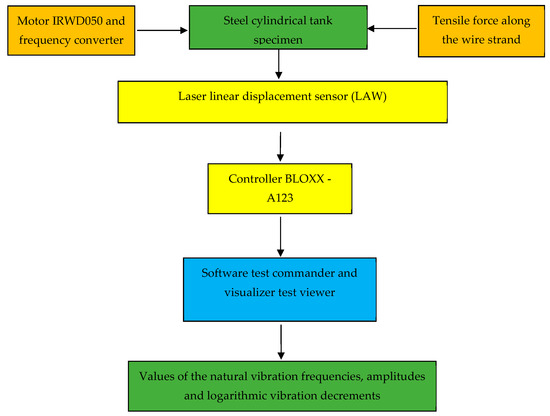 The measuring equipment, devices, and primary voltage converters were selected by considering the expected values from the required measured test parameters, temperature and humidity of the environment, as well as on the basis of some recommendations existing in the literature [44,45,46]. As a primary transducer for measuring the natural vibration frequencies of the steel tank specimen, as well as for determining the first two amplitude values (A1 − A2), a LAW laser linear displacement sensor and a BLOXX-A123 controller were utilized. Test commander software and a test viewer visualizer were instead adopted as secondary converters, where the corresponding variables were set up to measure the required parameters. When testing the specimens of the steel vertical tanks, the following geometric dimensions of the shells, prestressing parameters, and dynamic performance were simulated: