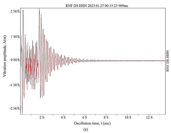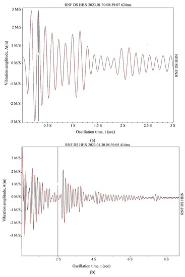The processed oscillograms of the free vibrations of the steel tank specimen wall at a loading of 1.5 Hz are shown in Figure 8a–c for all cases, which, in turn, are indicated in Table 5, Table 6, Table 7, Table 8, Table 9, Table 10, Table 11, Table 12 and Table 13. Other values of the free vibrations of the steel tank specimen wall at loadings equal to 0.5, 1.0, and 2.0 Hz were recorded in a tabular form (Table 5, Table 6, Table 7, Table 8, Table 9, Table 10, Table 11, Table 12 and Table 13).