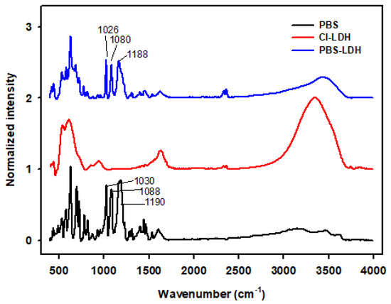 We have also carried out FT-IR tests to confirm the incorporation of PBS into LDH. Figure 1 shows the normalized intensity of the FT-IR spectra of PBS, chloride-LDH, and PBS-LDH. Neat PBS presents a peak at 1190 cm−1, ascribed to the asymmetric stretches of the sulfonate group [26]. The symmetric stretching vibrations of the group correspond to the wavenumbers from 1030 cm−1 to 1090 cm−1. When PBS is added to LDH, these peaks are clearly seen at 1026, 1086, and 1188 cm−1. This indicates that PBS was incorporated into LDH. The N-H hydrogen bonding of the imidazolium and the O-H stretching vibrations originate broader peaks, which were seen from 2950 cm−1 to 3550 cm−1 [27,28,29].