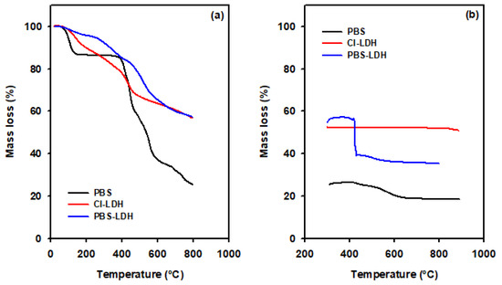 Thermogravimetric analyses were performed in a two-step experiment, firstly in an inert atmosphere (Figure 2a), followed by an oxygen atmosphere heating (Figure 2b). The neat PBS, Cl-LDH, and PBS-LDH were tested. PBS-LDH presented a slighter decomposition temperature than Cl-HDL in the range of 130–400 °C, followed by a rapid mass loss between 500 and 800 °C, which is in agreement with the decomposition steps seen for neat PBS. We confirmed the presence of the UV absorber by comparing the curves for PBS and PBS-LDH under an oxygen atmosphere.
