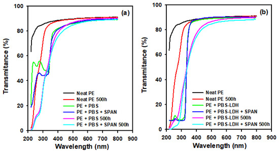 UV–visible spectrophotometry was used to evaluate the age-resistance effect of the addition of PBS and PBS-LDH on LDPE. The UV spectra when neat PBS was added indicate that this additive functioned as a UVB absorber below 330 nm (Figure 3). The acid form of PBS (2-Phenylbenzimidazole-5-sulfonic acid or PBSA) presented a strong activity at UVB (290–320 nm) wavelengths, attenuating the high-energy photons in sunlight [22,33]. Therefore, it is confirmed that PBS functioned as a UV absorber. On the other hand, when PBS was encapsulated in LDH, it is seen in Figure 3b that the UVB absorption of PBS was enhanced (Figure 3b), as was the light transmission in the visible spectrum. PBS-LDH showed a much better thermal stability than PBS because the UV absorber in PE + PBS films could be partially degraded during the casting process and the sunscreen activity is enhanced in the encapsulated form. In this regard, the addition of PBS-LDH showed improved age-resistance and is a suitable option for outdoors applications such as fabrication of greenhouses [34], pipe coatings [35], or insulation [36].