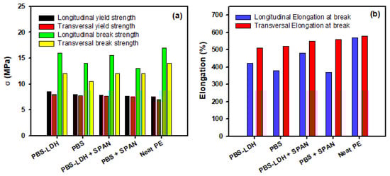 Tensile tests were carried out to explore the effect of the additives on the composites’ mechanical properties. Regarding the mechanical properties of the new films, the additives decreased the break strength of the composites (Figure 4a), mainly when SPAN was added, as expected. This decrease was more obvious in the transversal direction due to the lower directionality of the polymeric chains after extrusion [21]. Remarkably, the modified film with PBS-LDH presented the higher mechanical properties, indicating better interaction with the plastic. On the other hand, the yield strength was slightly improved in both the longitudinal and transversal directions when the additives were included. Figure 4b shows the values of the elongation at break. The modified films presented lower deformation than neat PE. Encapsulated PBS showed higher values of elongation, and the addition of surfactant improved the malleability of the films.