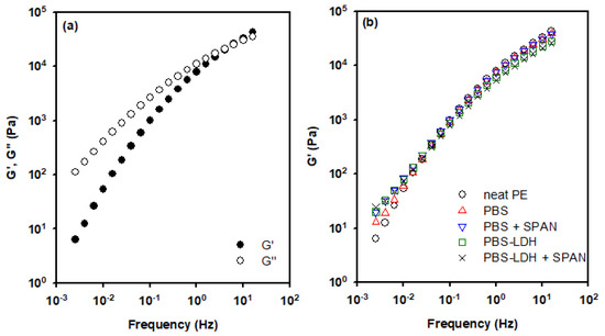 Figure 5. (a) Elastic (G′) and viscous (G″) moduli of neat PE and (b) influence of surfactant on the elastic modulus of films of PE, PE + PBS, and PE + PBS-LDH. Data at 190 °C.