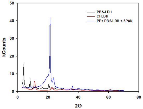XRD analysis of Cl-LDH, PBS-LDH, and the film including this additive are shown in Figure 6. When we compared the Cl-LDH with PBS-LDH, there was an increase in the basal d-spacing, and a shift in d003 and d006 peaks to lower values of 2θ was observed. Thus, there was an increase of the distance of the interlayers due to the replacement of chloride anions by PBS, in agreement with the FTIR and TGA data shown above. The figure also shows the PE film with PBS-LDH and the surfactant SPAN.