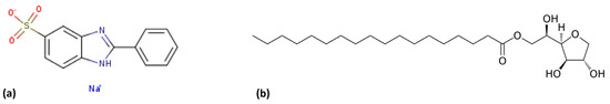 Sulfonic phenylbenzimidazole acid sodium salt (PBS) was employed as a UV absorber, with the molecular structure depicted in Scheme 1a. This additive was supplied by Chemspec Chemicals, with CAS number 5997-53-5. This chemical is used in sunscreen applications, and it has UV-B radiation absorption with a maximum of 302 nm. It presents a solubility of 24 g/L in water at 25 °C [24]. To improve the dispersion of the additives in the thermoplastic matrix, sorbitan monostearate (SPAN60), with CAS number 1338-41-6, was added. The formula of this hydrophobic surfactant is shown in Scheme 1b.