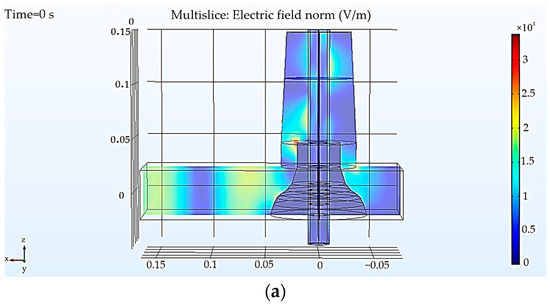 - The maximum electric field strength E near the input of microwave energy into the chamber is 8.2 × 103 V/m (Figure 10a), which is 31% less than the experimentally determined E.