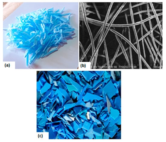 (a) Mask strip fiber, (b) SEM images of mask strip morphology, and (c) waste plastic aggregates used in this study.