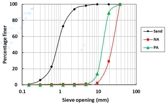 Sieve analysis of sand, coarse aggregate (CA), and plastic aggregate (PA).