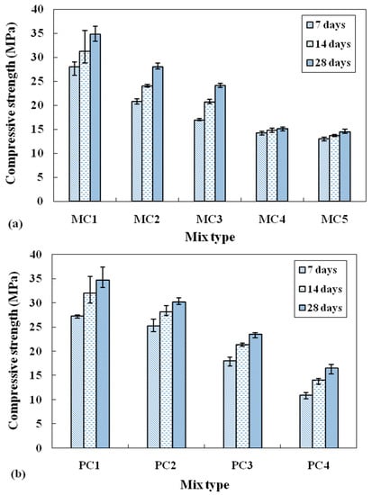 Compressive strength developments in (a) mask concrete (MC) and (b) plastic concrete (PC).