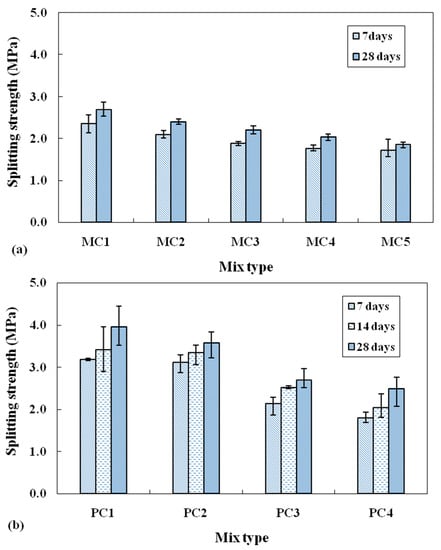 Splitting tensile strength in (a) mask concrete (MC) and (b) plastic concrete (PC) across different days.