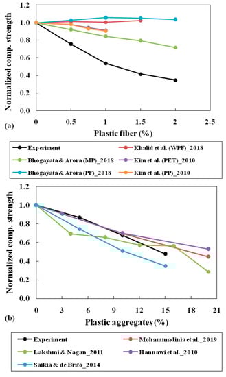 Normalized compressive strength of (a) plastic fiber and (b) plastic aggregates concrete [,,,,,,].