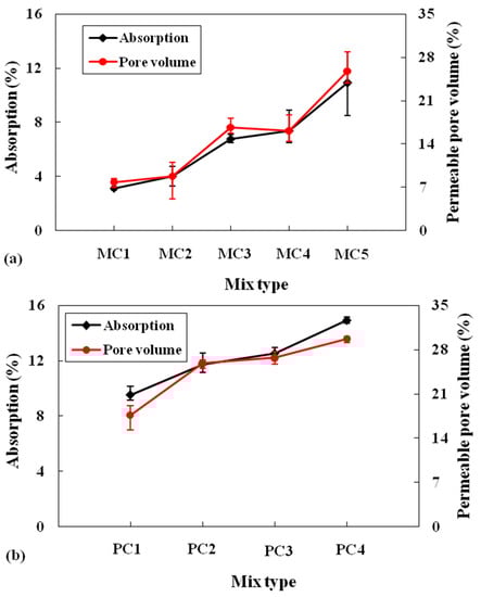 Percentages of water absorption and pore volume in (a) mask concrete (MC) and (b) plastic concrete (PC) samples after 28 days of curing.