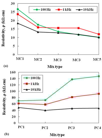 The ER values of both concrete types (MC and PC) are shown in Figure 10. Generally, at higher frequency levels, ER values in the samples are reduced, which is also observed in this study. The ER values gradually decrease as the mask strip content increases in the mixes, as presented in Figure 10a. At 1 kHz frequency level, the ER values of the samples are reduced by 48%, 52%, 52%, and 99% with the inclusion of 0.5%, 1%, 1.5%, and 2% mask strips in the concrete mixes. Higher pore volumes in the concrete samples due to the inclusion of mask strips may lead to lower resistivity of the concrete samples. As far as the authors know, to date, there is no research that has reported on the resistivity of concrete with mask strips. For plastic aggregate concrete, an opposite behavior of ER values is observed. In this case, the ER values at lower frequencies (100 Hz and 1 kHz) increase as the plastic aggregate content increases in the mix. Although the pore volume in this concrete also increases as the plastic content increases, there seems to be no relationship with the resistivity of the concrete. A study on the chloride ingress in plastic aggregate concrete also reported similar behavior of better performance than the control mix concrete []. The total charge passed through concrete samples is reduced as the plastic aggregate content increases. This behavior of plastic aggregate concrete could be attributed to the impervious nature of plastic aggregate, which can create a physical obstacle for the charge passing through the samples []. At 15% replacement level with plastic aggregates, the ER increased to a maximum of 52% and 33% for 100 Hz and 1 kHz applied frequencies when compared with the control samples of concrete mix.