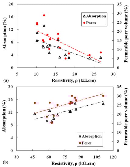 Relation of resistivity to the absorption and pore volume of the (a) mask strips and (b) plastic aggregate concrete samples.