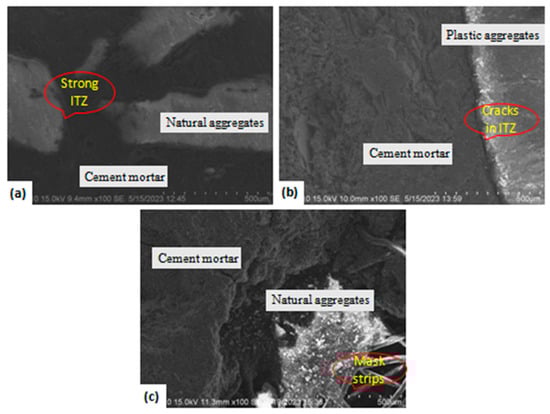 The SEM analysis for the microstructure of the different hardened concrete mixes (PC1, PC3, and MC3) is presented in Figure 12. An improved ITZ is found for the reference concrete mix of PC1, as shown in Figure 12a. The inclusion of 10% PA significantly affects the ITZ of PC3 concrete samples, as shown in Figure 12b. In this case, a visible crack is observed between the cement paste and PA. This could be attributed to the hydrophobic nature of plastic, which may weaken the bond strength between the cement paste and the surface of PA. Introducing mask strips also leads to weak microstructure in concrete, as shown in Figure 12c. Since mask strips contain multiple fibers together, as reported in Figure 1b, it can form pores in the matrix and lead to lower strength and higher water absorption, as reported in Figure 6 and Figure 9.