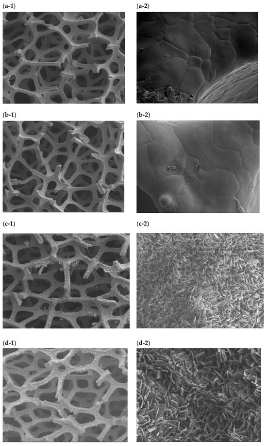 SEM images with 70× and 3000× magnification: (a-1,a-2) original NF, (b-1,b-2) NF@, (c-1,c-2) NiCo MOFs/NF@, (d-1,d-2) NiCo MOFs/NF@-Ar, (e-1,e-2) NiCo MOFs/NF@-AH, and (f-1,f-2) NiCo MOFs/NF@-AO.
