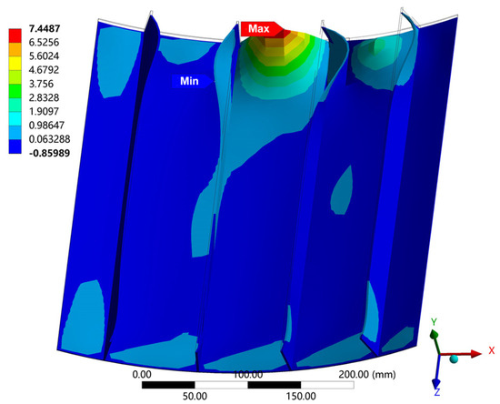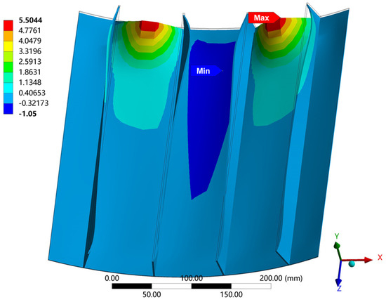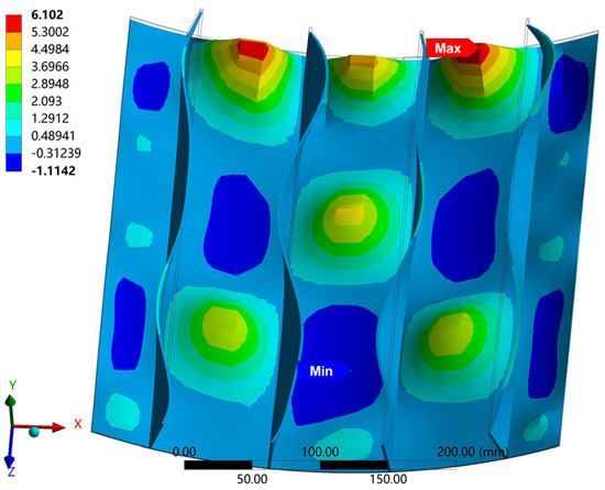 When the skin is made of carbon/epoxy plies and the stiffeners are made of E-glass/epoxy plies, the critical buckling load is 30,060 N, and the buckled shape is shown in Figure 3. The contours show the y displacement in mm. The maximum displacement is 7.45 mm. Compared to all the carbon/epoxy composites, when the stiffeners are made of E-glass/epoxy composite, the critical buckling load only decreases slightly by 0.27%.