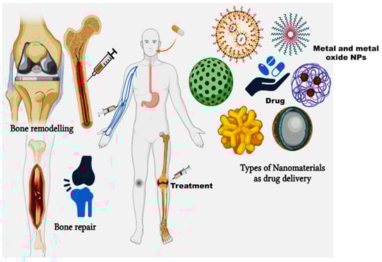 Types of nanomaterials as drug delivery systems in bone repair and remodelling.