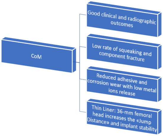 26]. In 2017, Schouten published a study between CoM and MoM in 83 patients, demonstrating significantly lower values of blood metal ions in the CoM group, good clinical outcomes, and a low rate of implant revision [