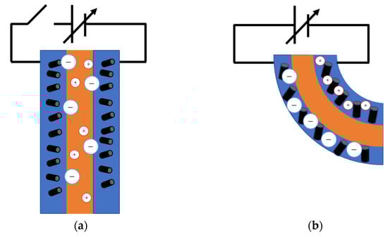 Operation of the paper actuator where the anion size is larger than that of the cations. (a) Before applying voltage. (b) After applying voltage (from Ref. [] under a CC BY 4.0. license).